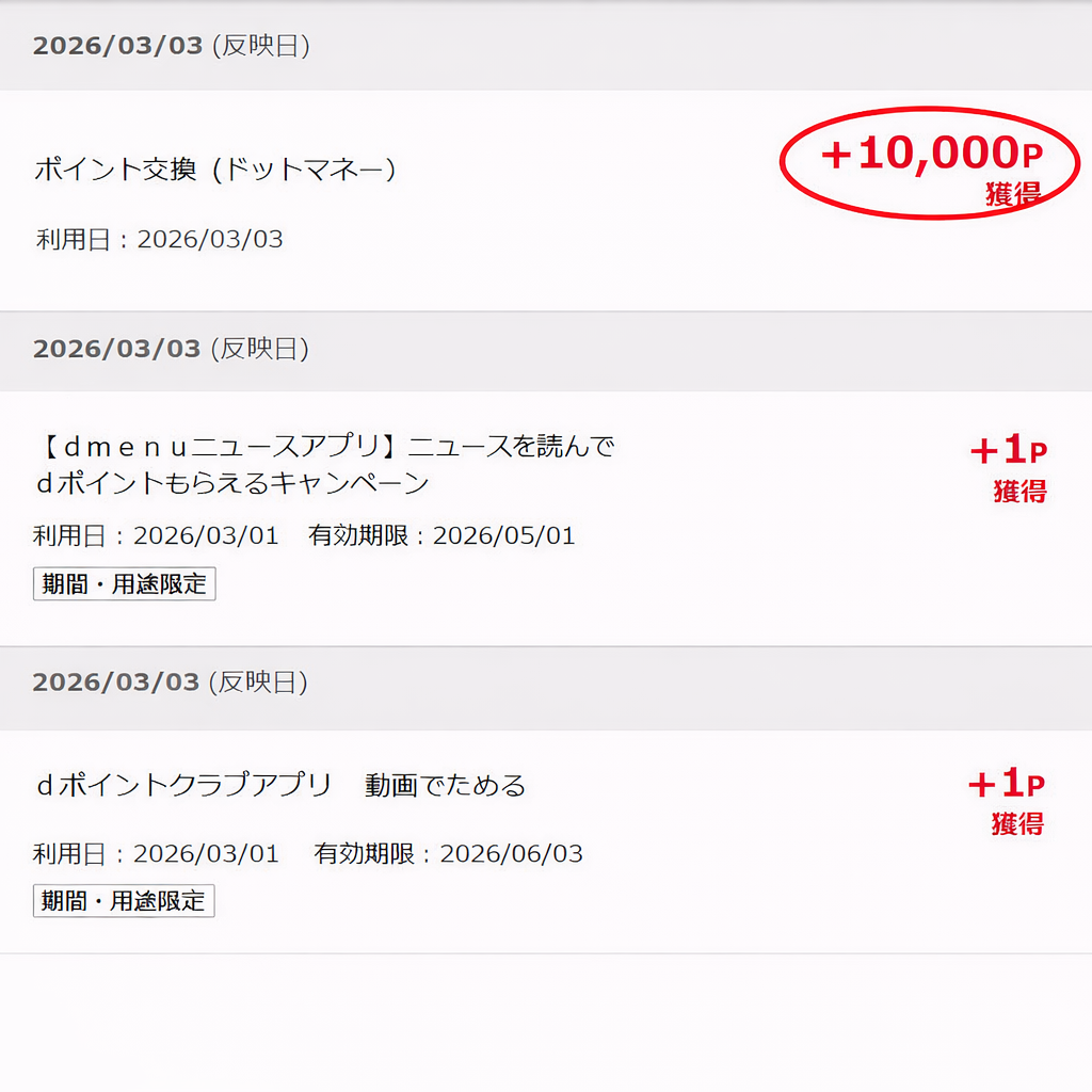 ドットマネーから交換したポイントは、このようにdポイントとして反映されます