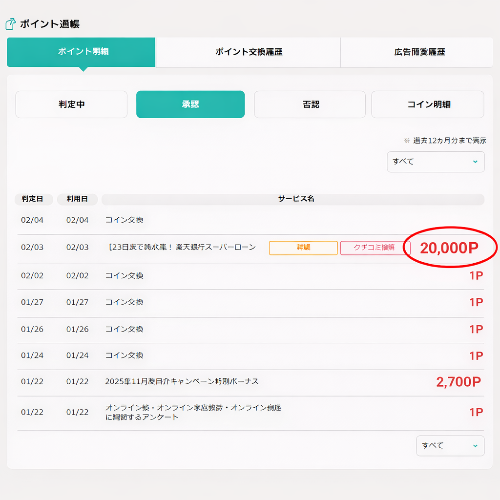 ※楽天銀行のローン契約で20,000ポイント獲得した実績です