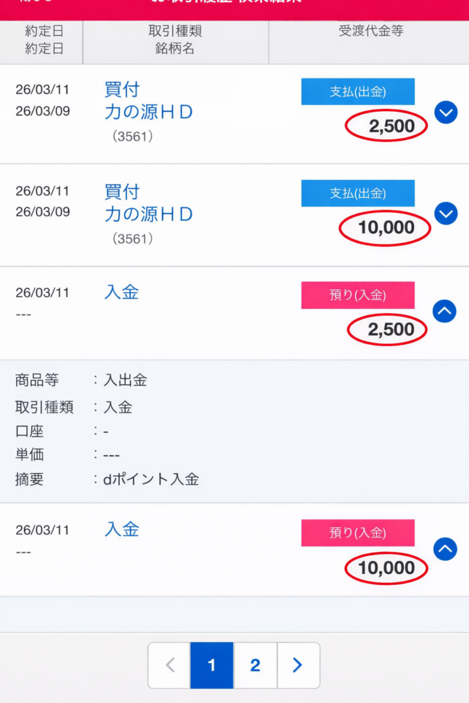 ※日興フロッギーでdポイントを使って実際に株を購入した履歴です